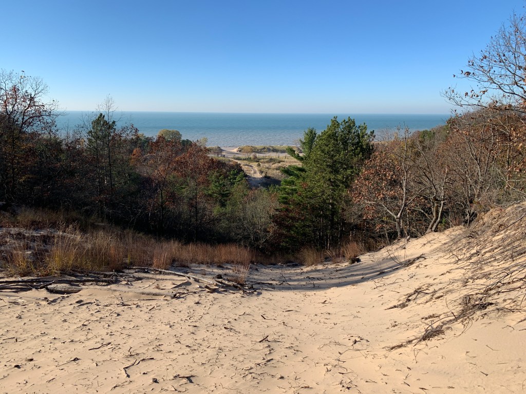 Description: This trail starts at the top of Mount Baldhead and follows a steep ridge down, ending at a turnaround area on the north side of Perryman Street, near the entrance to Oval Beach. The path offers beautiful views of Lake Michigan, but there are steep sections at both ends. Much of the trail is shifting sand, including a short section at the top of an exposed dune.